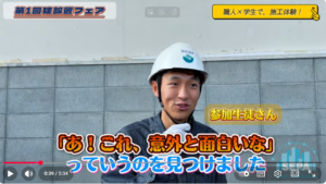 報告動画では学生さんのインタビューも盛り込まれていますし、施工体験学習の様子もとてもよくわかります。インスタで報告動画をアップしていますが、インスタとは違う視点や表現で作成されているので是非ご覧くださいね!報告動画はYouTubeにアップしています!下の文字をクリックしてもらうとYouTubeにとびます。