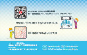 この名刺サイズチラシは、「第2回 建設匠フェア 2026」で初めての試みになります。協力企業さんが名刺と一緒にお渡ししてもらえるように名刺サイズにしました。こちらは毎年イメージカラーが変わるチラシと違って、当法人のイメージカラーで作成し、毎年内容だけを修正しながら使ってもらう予定です。