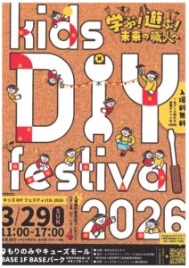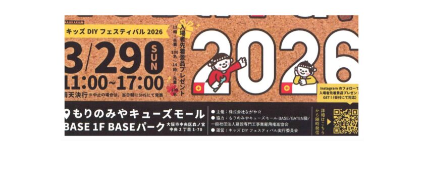 「kids DIY festival 2026」は「学ぶ!遊ぶ!未来の職人へ」をテーマに「もりのみやキューズモール BASEバーク」で子供ちゃん対象のDIY体験イベントです。