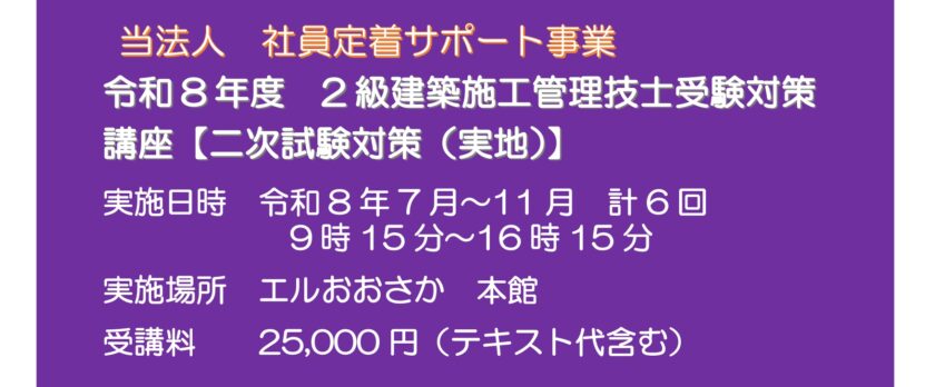 こんにちは!今日は当法人「社員定着サポート事業」として実施する「令和8年度 2級建築施工管理技士受験対策講座【二次試験対策(実地)】」のご案内です。