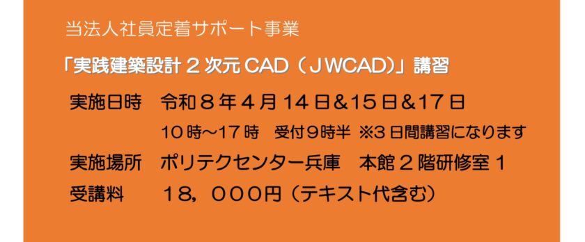 本年度に3日間に増やして実施した「実践建築設計2次元CAD(JWCAD)」講習は、内容・日数とも非常に好評だったので、令和8年度も同じ授業内容で実施します。一つの基本的な図面を仕上げることができるように演習の時間を設け個人的に先生に指導してもらえるようにカリキュラムを作ってもらっているので、本年度の受講生は3日目には自分である程度工夫しながら図面を描けるようになっていました。こちらの講習は「ポリテクセンター兵庫」さんに団体としてCAD初心者の社員用オーダー講習としてつくってもらっていますので、CADの基本を学習したいという方ならどなたでも受講して頂けます。