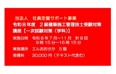 こんにちは!今日は当法人「社員定着サポート事業」として実施する「令和8年度 2級建築施工管理技士受験対策講座【一次試験対…